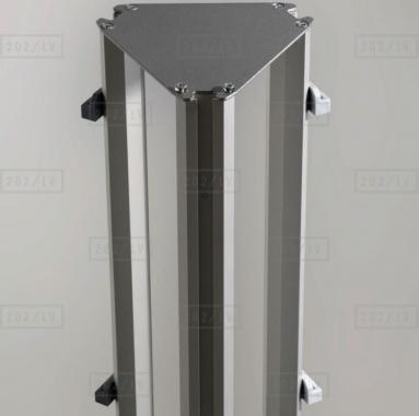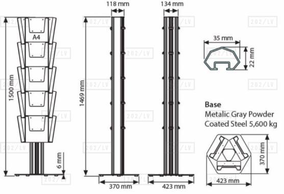 Trīspusējais informācijas stends ir balstīts uz trim alumīnija statīviem, pie katra no tiem piestiprināmi līdz pieciem organiskā stikla informācijas turētājiem. Informācijas stends ir pieejams ar organiskā stikla informācijas turētājiem trīs standarta izmēros - A4; A5 vai divdaļīgiem 1/3 A4. Pamatpiedāvājuma stenda komplektācija sastāv no stenda pamatnes, trim alumīnija statīviem un 15 attiecīgā izmēra organiskā stikla informācijas turētājiem. Ir iespējams viena stenda ietvaros kombinēt dažādu izmēru organiskā stikla informācijas turētājus - šādā gadījumā, lūdzu, sazināties ar mums individuāli.