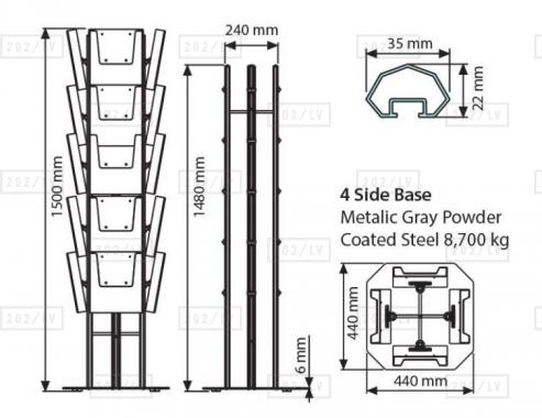 Četrpusējais informācijas stends ir balstīts uz četriem alumīnija statīviem, pie katra no tiem piestiprināmi līdz pieciem organiskā stikla informācijas turētājiem. Informācijas stends ir pieejams ar organiskā stikla informācijas turētājiem trīs standarta izmēros - A4; A5 vai divdaļīgiem 1/3 A4. Pamatpiedāvājuma stenda komplektācija sastāv no stenda pamatnes, četriem alumīnija statīviem un 20 attiecīgā izmēra organiskā stikla informācijas turētājiem. Ir iespējams viena stenda ietvaros kombinēt dažādu izmēru organiskā stikla informācijas turētājus - šādā gadījumā, lūdzu, sazināties ar mums individuāli.
