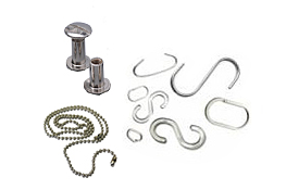 Āķi, saspraudes, bumbiņķēdes, skrūves, abpusējā līmlenta