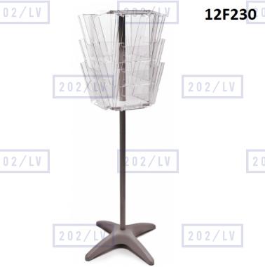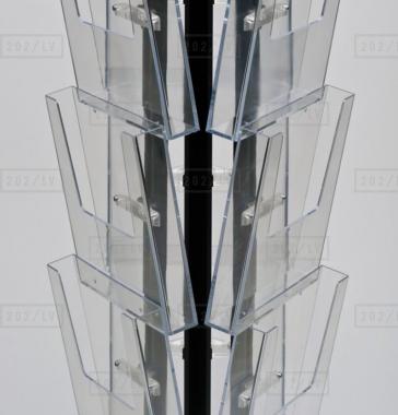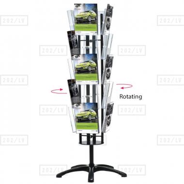 Rotējošais informācijas stends ir balstīts uz četriem statīviem, pie katra no tiem piestiprināmi līdz pieciem organiskā stikla informācijas turētājiem. Informācijas stends ir pieejams ar organiskā stikla informācijas turētājiem trīs standarta izmēros - A4; A5 vai divdaļīgiem 1/3 A4. Pamatpiedāvājuma stenda komplektācija sastāv no stenda statīva un 20 attiecīgā izmēra organiskā stikla informācijas turētājiem. Ir iespējams viena stenda ietvaros kombinēt dažādu izmēru organiskā stikla informācijas turētājus - šādā gadījumā, lūdzu, sazināties ar mums individuāli. Cena pēc pieprasījuma.