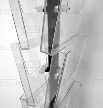 Trīspusējais informācijas stends ir balstīts uz trim alumīnija statīviem, pie katra no tiem piestiprināmi līdz pieciem organiskā stikla informācijas turētājiem. Informācijas stends ir pieejams ar organiskā stikla informācijas turētājiem trīs standarta izmēros - A4; A5 vai divdaļīgiem 1/3 A4. Ir iespējams viena stenda ietvaros kombinēt dažādu izmēru organiskā stikla informācijas turētājus - šādā gadījumā, lūdzu, sazināties ar mums individuāli. Cena pēc pieprasījuma.