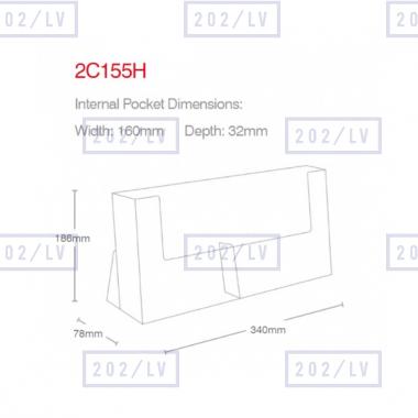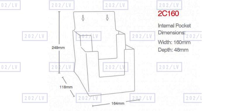 2 kabatu A5 vertikāls bukletu turētājs. Novietojams uz galda (brīvi stāvošs) vai stiprināms pie sienas. Kabatas iekšējie izmēri 160 x 48mm. Papildus iegādājamie aksesuāri: CLW, HB1 & SWB1.