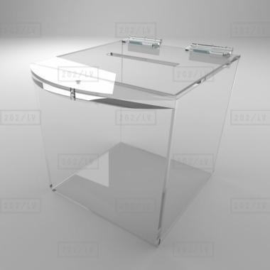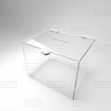Organiskā stikla (akrila) kaste izmantojama gan aptaujām, gan ziedojumiem. Ziedojumu kastes izmērs: 15(dziļums)x24(platums) x30 (augstums)cm; šī ziedojumu kastes ražota no 5mm bieza materiāla. Kastes aizmugurē iestrādāti caurumi skrūvēšanai pie sienas. Aizslēdzama ar piekaramo atslēgu, kas nopērkama atsevišķi.